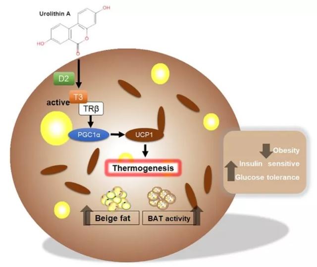 进一步研究发现,UA对脂肪产热的促进作用并非依赖于常规的β-肾上腺素信号,而是依赖于甲状腺素信号。它能将甲状腺素中活性较弱的T4转化为活性较强的T3,通过甲状腺素信号增强代谢率和产热。