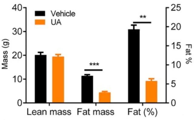 对小鼠身体组成的分析显示,UA组小鼠减少的体重,基本都是脂肪。相比对照组小鼠,UA组小鼠的脂肪量减少了61.3%,体脂率不到对照组的三分之一。