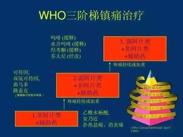 关于三阶梯的描述,前面也已经讲到,这里再用通俗的语言表达下:不怎么疼的用非阿片类药,比较疼的用弱阿片类药,疼的受不了的用强阿片类药。