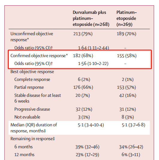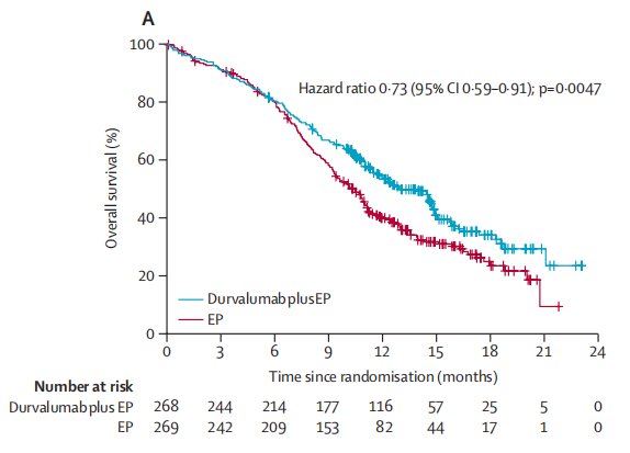 目前公布的数据是度伐利尤单抗联合标准治疗(SoC)铂 依托泊苷的化疗方案,与标准治疗(单纯化疗)相比的研究结果。用药方式为使用固定剂量的度伐利尤单抗(1500mg)联合化疗,每三周给药一次,持续4个周期,然后单药维持每四周给药一次,直到病情进展。