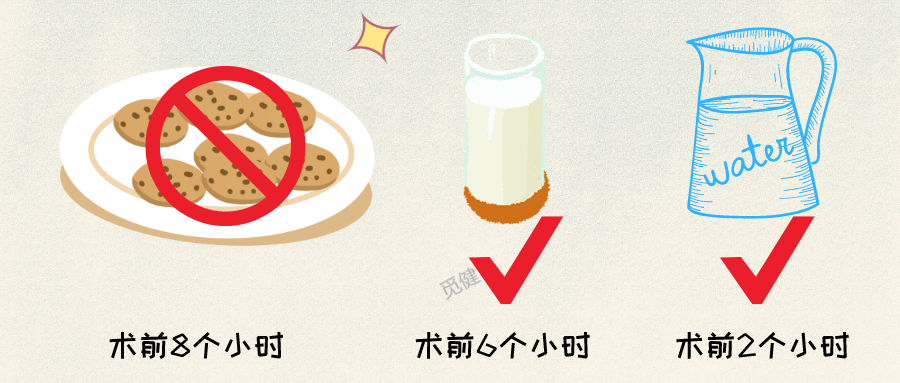 手术前8个小时开始不吃固体的食物,术前6个小时可以喝牛奶,术前2小时可以喝少量水。