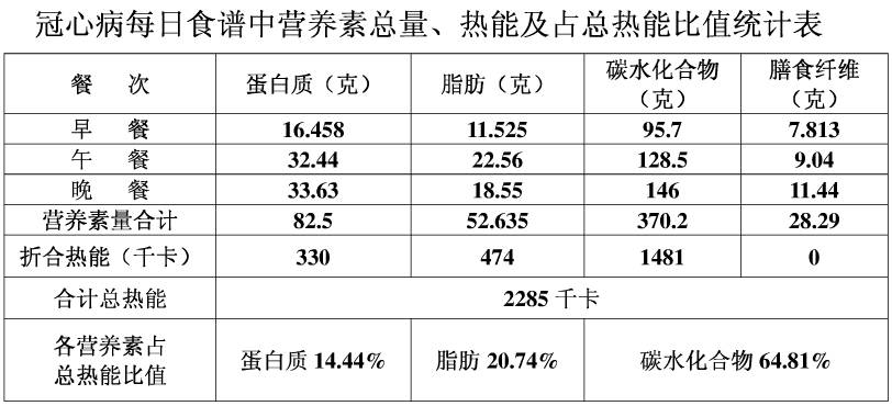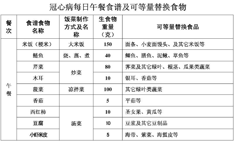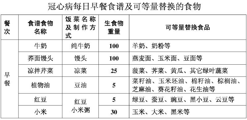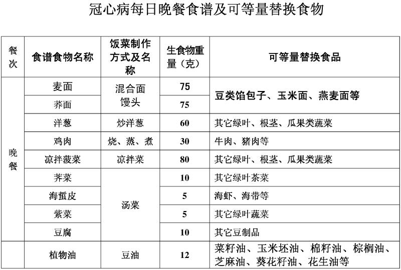 为方便冠心病患者在日常生活中的饮食辅助治疗,编制了《冠心病患者每日食谱(建议)》,其食物的选择有利于冠心病、高血压、高血脂患者的饮食治疗,该食谱食物供给量总热能适中,各营养素供能占总热能的比值适当,各种食物等量替换便于掌握和操作。