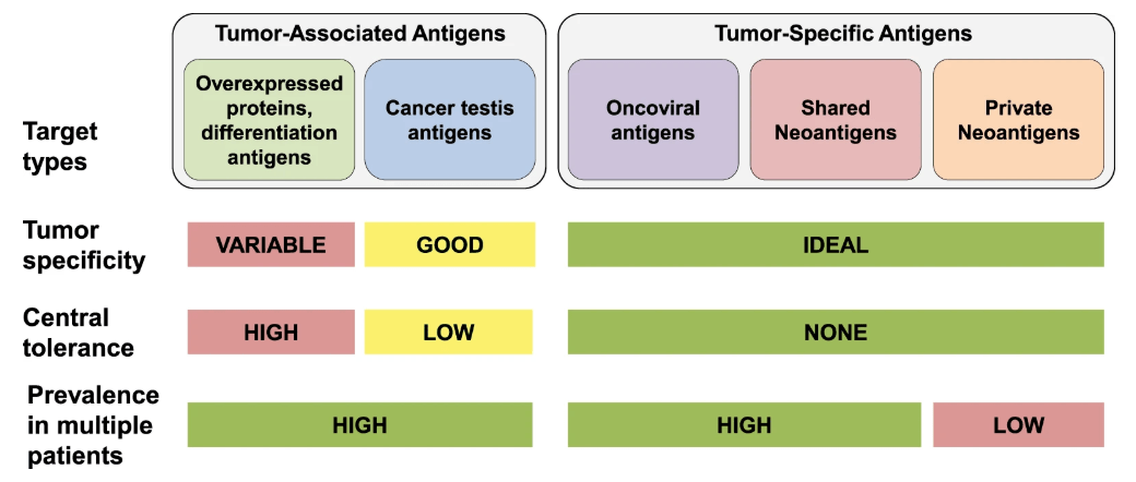 · TAAs是肿瘤细胞中优先或异常表达的自身抗原,但在正常细胞中也可能有一定程度的表达。由于TAAs是自身抗原,能够以高亲和力与TAAs结合的T细胞通常会被中央和外周耐受机制从免疫组库中删除,因此基于TAAs开发的癌症疫苗通常效力不足,许多疫苗试验显示的T细胞反应非常微弱。