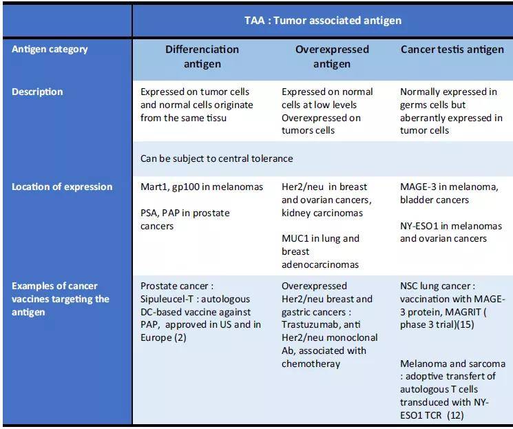 肿瘤相关抗原(tumor associated antigens , TAAs)在正常细胞中也表达,包括分化抗原、过表达抗原和癌-睾丸抗原。其中,分化抗原仅在肿瘤细胞及其起源健康组织中表达,如前列腺特异性抗原(PSA)和前列腺酸性磷酸酶(PAP) 存在于正常前列腺和癌性前列腺中。