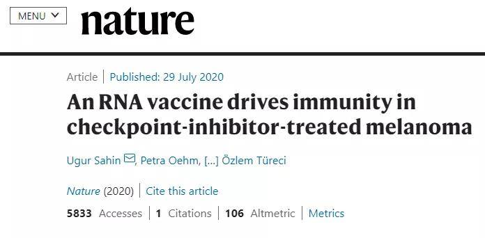 7月29日,在发表于Nature杂志上的一篇论文中,来自德国的一个科学家团队描述了一种基于肿瘤相关抗原(TAAs)的黑色素瘤RNA疫苗首个I期人体试验(NCT02410733)的中期结果。令人鼓舞的是,数据显示,名为FixVac的这款疫苗能够诱导针对TAAs的效应T细胞响应,介导接受过免疫检查点阻断疗法治疗的黑色素瘤患者持久的客观缓解。