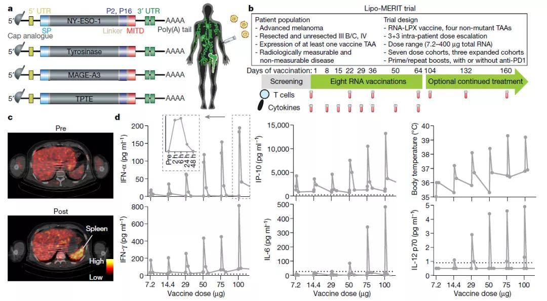 分析显示,接种疫苗后,患者脾脏代谢活动增加,表明淋巴组织中的免疫细胞TLR激活。此外,患者体温和炎症细胞因子(IFNα、IFNγ、IL-6、CXCL10和IL-12p70)血浆水平也短暂升高,且升高的幅度随着RNA剂量的增加而变大。安全性方面,不良临床事件包括轻至中度的流感样症状,但这些都是可控制的,大部分可在24小时内解决。
