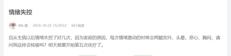 觅友小吴,治疗期间容易出现情绪失控,当她无法进行情绪调控时,身体马上出现反抗,头晕、恶心、胸闷、双手发抖的症状。这些症状又进一步引发了她对转移复发的担忧,负面情绪层层叠加,影响的是治疗效果以及生活质量。