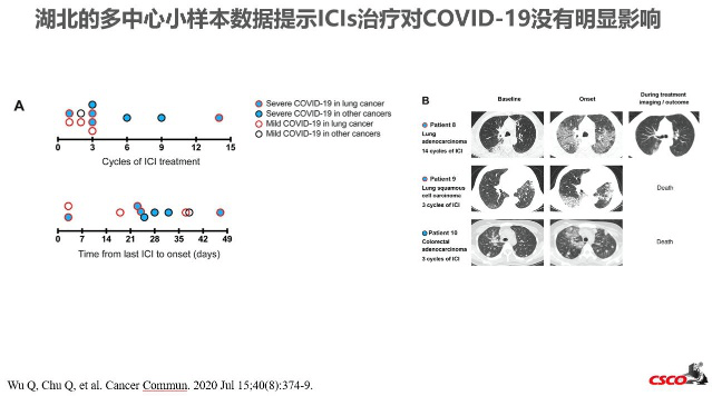 近几年,免疫治疗成为肿瘤治疗的新方向,尤其是以PD-1/L1抗体为代表的药物在多瘤种获得适应症。肿瘤免疫治疗对COVID-19病毒感染的是否存在潜在影响呢?众所周知,ICI在免疫系统对抗免疫抑制微环境中的作用,PD-1表达可能与COVID-19重症感染CD8 T细胞耗竭有关,因此阻断PD-1/PD-L1相互作用或可提高病毒清除率。湖北的多中心小样本数据提示ICIs治疗对COVID-19没有明显影响,肺癌中的数据亦提示相同的结论。
