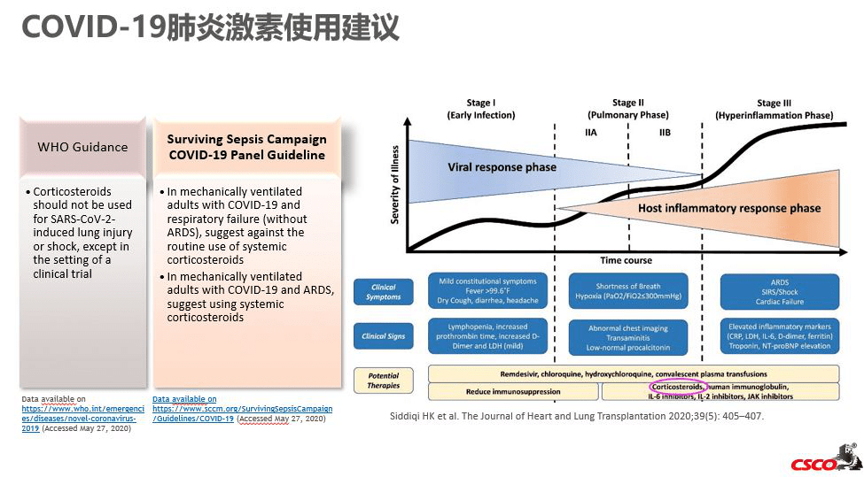 对比新冠肺炎与免疫治疗相关性肺炎,二者最为重要的差异为激素的使用。WHO指南建议:新型冠状病毒感染治疗,不推荐常规应用全身糖皮质激素,我国学者建议全身糖皮质激素应慎用。