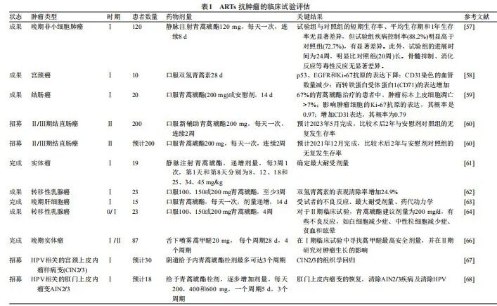 此外在其他癌症,如乳腺癌、宫颈癌、结直肠癌等癌种中,青蒿素均初步展现出其独特的抗癌功效。具体的研究成果可见下表: