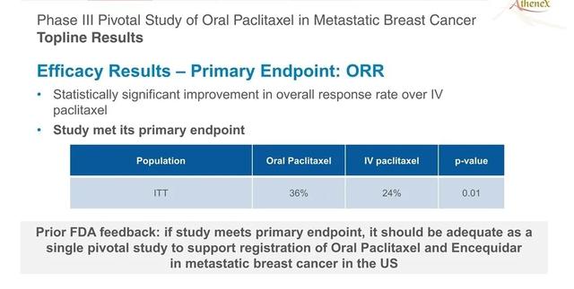 1、与静脉注射紫杉醇相比,口服化疗的总体缓解率(ORR)具有统计学上意义上的显著改善,达到了其主要终点。