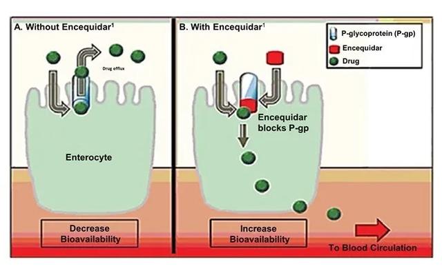Encequidar是一种选择性的P-gp抑制剂,特点是不会被吸收。因此,它可以抑制胃肠道中P-gp的活性,提高对化疗药物的吸收。而且,它不会与身体其它部位的P-gp相互作用,减少对身体其它部位的副作用。