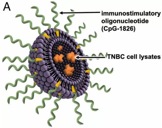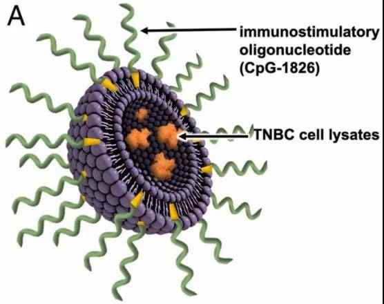 首先,研究人员确定了免疫系统“训练师”——肿瘤相关抗原(TAA),来自被“捣碎”的三阴性乳腺癌细胞;其次,确定了免疫系统的“挑衅者”——寡核苷酸(CpG-1826),一种DNA佐剂,接着,用纳米级的“包装袋”——脂质体球形核酸(SNAs)将二者包裹,以便统一递送。