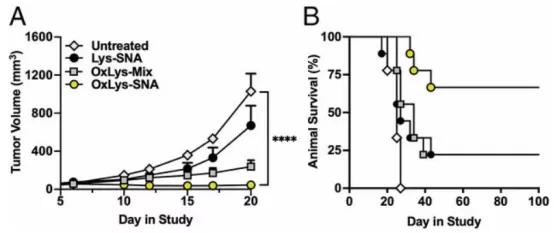 果不其然,由氧化裂解物制成的球形疫苗发挥出了惊人的效果:它不仅使三阴性乳腺癌小鼠在第20天得到肿瘤完全缓解,并且还帮助三分之二的小鼠在没有明显的副作用的情况下,轻松地活过了100天!