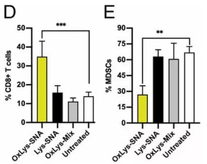 为何会有这么神奇的效果呢?研究人员将小鼠体内的肿瘤取出,通过免疫细胞类型的鉴定分析,得出了令人兴奋的发现:在接受氧化裂解物制成的球形疫苗的小鼠肿瘤中,具有杀伤效力的T细胞显著增加了2.3倍,而免疫抑制性细胞的数量则减少了2.5倍。也就是说,这种新型疫苗不仅能加强机体的抗肿瘤能力,还能削减抗肿瘤过程中的不利因素,可谓是一举两得。