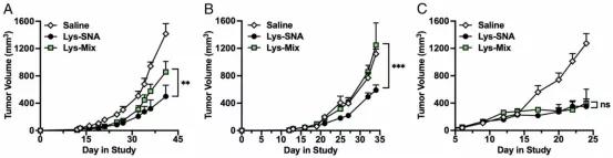 为了对比了“大杂烩”和“快递包裹”的效果,研究人员设置了三种疾病模型,每一种癌症的小鼠都分别接受生理盐水、混合疫苗、球形疫苗。结果发现,球形疫苗比混合疫苗更有效地抑制了小鼠肿瘤的生长:对比生理盐水,疫苗使肿瘤减小了42%、53%和73%!