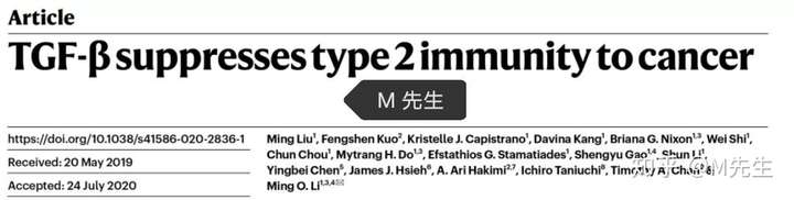 2020年10月21日,纪念斯隆凯特琳癌症研究中心(Memorial Sloan Kettering Cancer Center)的免疫学家Ming O. Li教授在Nature杂志上发表两篇“背靠背”文章TGF-β suppresses type 2 immunity to cancer 和Caner immunotherapy via targeted TGF-β signaling blockade in TH Cells。其中,一篇是基础加转化性研究,另一篇是转化性研究。