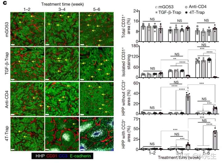 在这个过程中,为肿瘤组织提供营养的血管组织生长模式被重塑,且血管周围形成一堵致密的“保护墙”,从而阻止癌细胞摄取营养物质。这些研究结果,发表在第一篇Nature论文上,结果显示在CD4 T细胞上阻断TGF-β信号通路,能够激活强大的伤口愈合反应,从而阻止癌细胞的生长。但是,如果肿瘤的生长已经形成,是否通过阻断TGF-β信号通路依然能够阻滞肿瘤生长?在第二篇Nature论文中,Ming O. Li教授团队回答了这个问题。