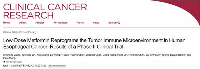 2020年8月4日,暨南大学和美国德州大学MD安德森癌症中心的研究团队,在美国癌症学会杂志《Clinical Cancer Research》上发表了全球第一个应用二甲双胍治疗食管鳞癌的临床研究数据。