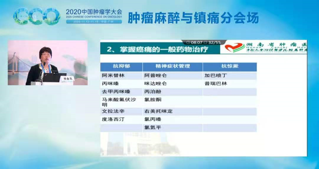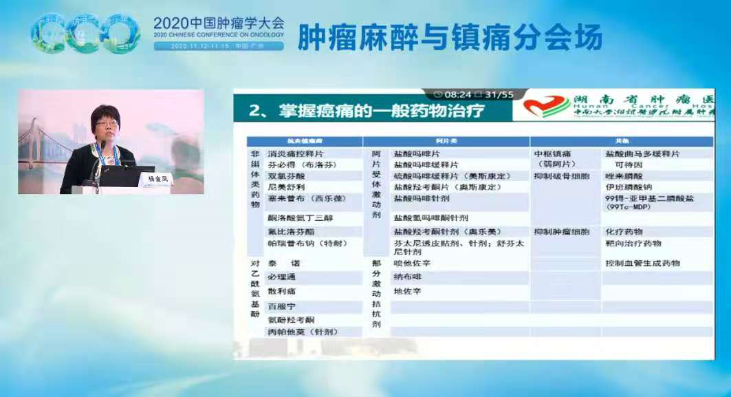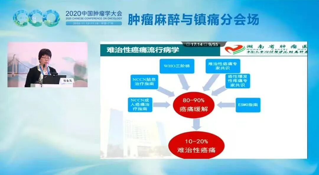 2020年11月12-15日,2020年中国肿瘤学大会(CCO)年会在广州召开。本次大会可谓大咖云集,亮点纷呈。在11月15日上午的肿瘤麻醉与镇痛分会场,湖南省肿瘤医院的杨金凤教授和我们分享了关于难治性癌痛患者的综合管理。