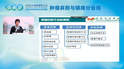 湖南省肿瘤医院麻醉科的杨金凤教授从患者、医源性以及其他外在的因素三个方面分享了目前癌痛控制不佳的原因。