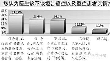 但广州某三甲医院的一项调查结果却显示,患者与家属在对病情的告知需求上具有显著差异:被调查者中,93%的癌症患者渴望知道自己的病情;而大部分家属 不想或不完全想病人被告知,22%选择不告知,52%选择不完全告知;28%家属选择等到亲人治疗恢复良好、21%等到病情无法隐瞒时告知;即使是在患者 坚持告知的情况下,也只有48%的家属选择如实告知。